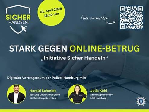 Am 01.04.2026 um 18:30 Uhr sprechen Harald Schmidt von der Stiftung Deutsches Forum für Kriminalprävention (DFK) und Julia Kühl von der Kriminalprävention des LKA Hamburg über das „Sichere Handeln“ in der Online-Welt.